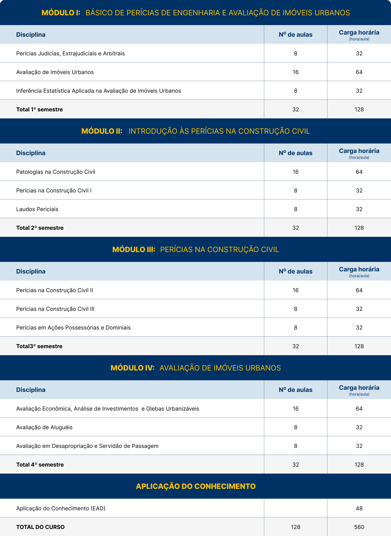 Conforme grade curricular abaixo, o curso é composto por disciplinas inerentes às atividades de Perícias de Engenharia e Avaliações de Bens, ministradas por especialistas e atuantes nessas áreas do conhecimento.